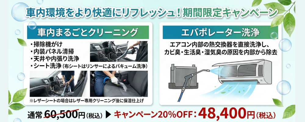 そんな悩みは、プロ仕様のリンサーと高温スチームで徹底洗浄し、車内の空気までスッキリ衛生的に仕上げます。