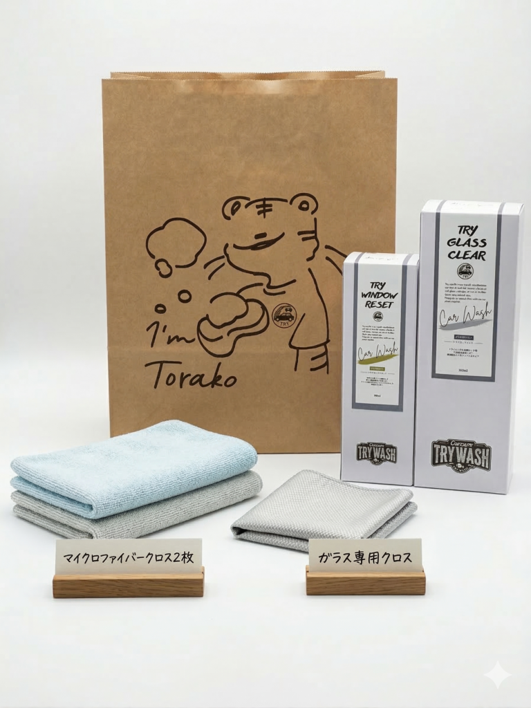 どちらも施工後にそのままお使いいただける、実用的なカーケアセットです。また、クロスは写真と色味が違うこともございますのでご了承ください。