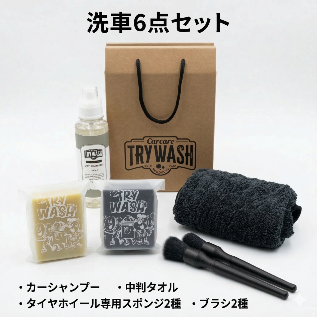 Aセット(洗車6点セット)またはBセット(窓ガラス5点セット)のいずれかをプレゼントしております。